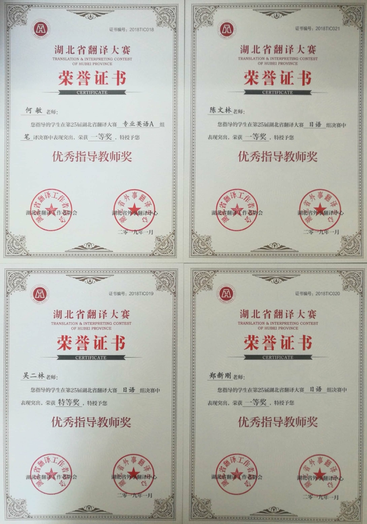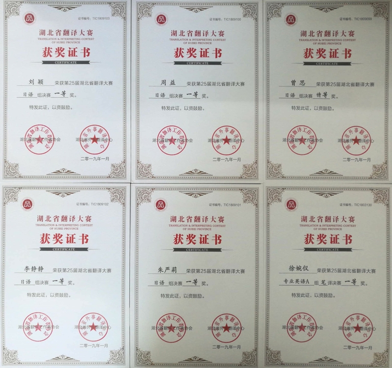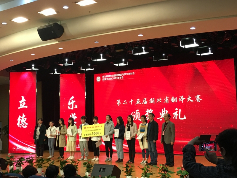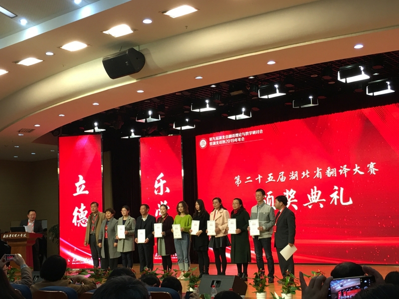 2019年3月31日,第二十五届湖北省翻译大赛颁奖典礼在武汉华夏理工公司举行。威廉体育williamhill曾思同学获日语组特等奖,徐婉仪同学获专业英语A组笔译一等奖,周益、朱严莉、李静静、刘颖等4位同学获日语组一等奖,夏芷欣等19位同学获各组别二、三等奖。威廉体育williamhill郑新刚、吴二林、陈文林、何敏等4位老师被评为优秀指导老师,罗彬老师被评为优秀组织工作者,威廉体育williamhill获优秀组织奖。