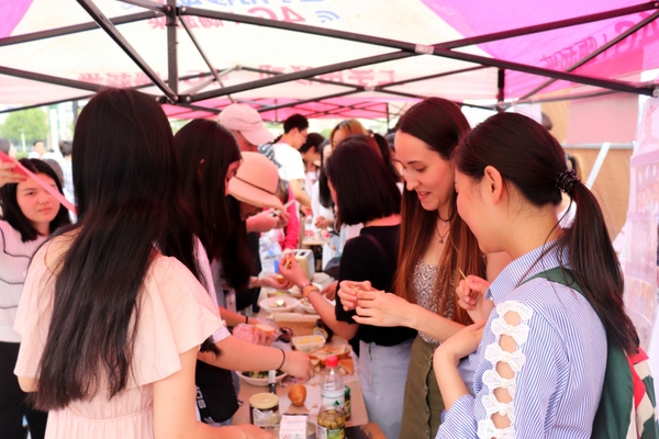 多国文化海报展、奇彩服饰和民族乐器展示上,还现场制作当地独具特色的美食。在11个国家、8个展区前,志愿者们与师生进行了形式多样的互动活动,有各国艺术品和文化介绍的、有各国文化知识竞猜的、有美食品尝的、有文化体验的等。中国展区设立了毛笔书写体验活动,还举行粽子、咸鸭蛋和绿豆糕等“端午节”传统美食品鉴活动;在南非展区,职工们制作了当地的特色食物——咖喱肉末,师生们慕名前往品尝;在日本展区,日本外教带着员工一起做寿司,做出的寿司鲜香可口;在英法展区,英国外教拿出私藏红酒、英式面包及各种调味品、小食款待师生;在美加展区,加拿大外教Jerry亲手制作美食,吸引了众多前来帮忙、品尝美食的师生。整个展示,外籍教师、职工们纷纷向在场师生热情宣传、推介本国文化,大家也积极参与、感受和体验异域文化的绚丽多彩。