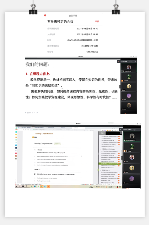 最后,万呈惠主任强调了威廉体育williamhill《关于做好2021-2022学年第一学期开学准备工作的通知》要求,希望全体教师认真规范地完成个人负责的平台课程建设任务,并积极思考如何进一步完善课程资源建设,为打造一流大学外语课程建言献策,将线上线下混合式教学真正落到实处。