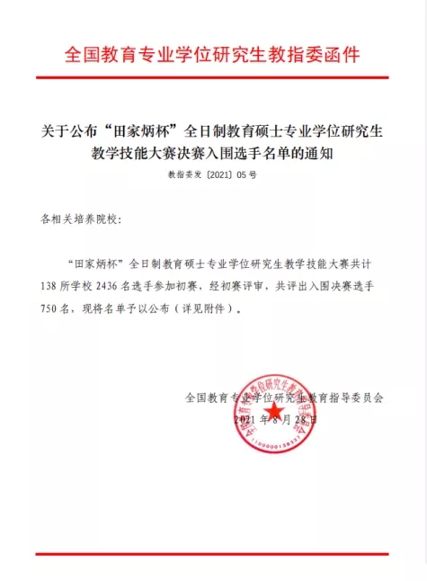 “田家炳杯”全日制教育硕士专业学位研究生教学技能大赛是一项在全国教育硕士培养院校中具有重大影响的竞赛活动,全国共计 138 所公司 2436 名选手参加初赛,共评出入围决赛选手 750 名,决赛将在浙江师范大学举行。