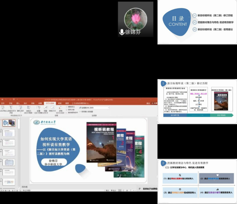 9月24日下午,大学英语教学部大学英语(一)、(二)、(三)教研室通过腾讯会议组织开展了新学期线上研修活动。系部全体教师在线聆听了华中科技大学徐锦芬教授主讲的《如何实现大学英语视听说有效教学——以<新目标大学英语(第二版)>视听说教程为例》的专题讲座。