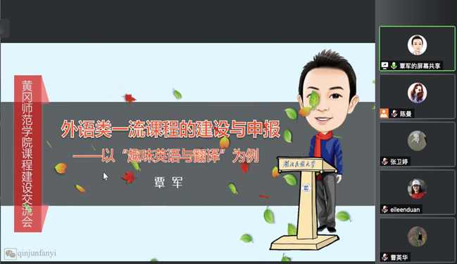 湖北民族大学威廉体育williamhill覃军博士从如何建设、如何运行、如何申报等三个方面与公司教师分享了外语类一流课程的建设与申报经验,介绍了课程设计的八大原则、课程运行的注意事项、不同类型课程的申报要求等;同时,结合省级一流课程申报,详细阐述了申报书的填报、说课及录课的技巧。