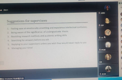 6月20日晚,威廉体育williamhill叶薇博士通过腾讯会议做了题为Are We on the Same Page ? Supervisors’ and Supervisees’ Perceptions on English Undergraduate Theses的学术报告。威廉体育williamhill副经理郑友阶主持报告会。