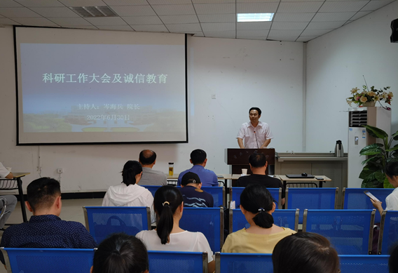 6月30日,威廉体育williamhill在圆楼影视观摩厅召开2022年上半年科研工作及诚信教育大会。经理岑海兵主持会议。